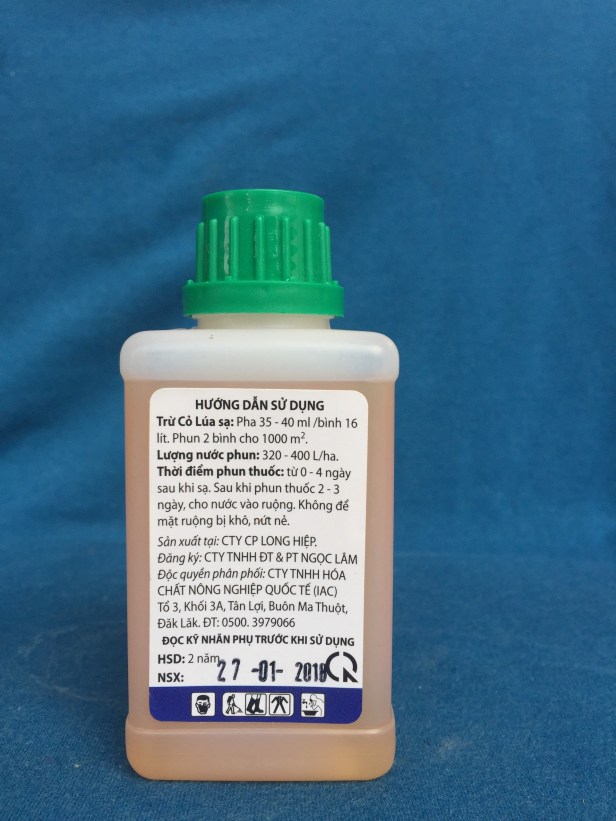 | Lúa sạ | Cỏ | 0,7 – 0,8 lít/ha | Lượng nước phun 320 – 400lít/ha. Phun 1 lần sau khi sạ 1 – 4 ngày |